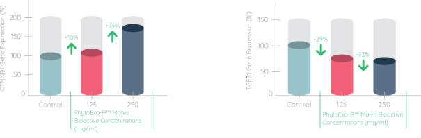 Hücrelere 0,125 mg/ml PhytoExo-R™ Malva uygulandığında CTNNB1 geni ifadesi %10, 0,25 mg/ml uygulandığında ise %73 oranında artmıştır.